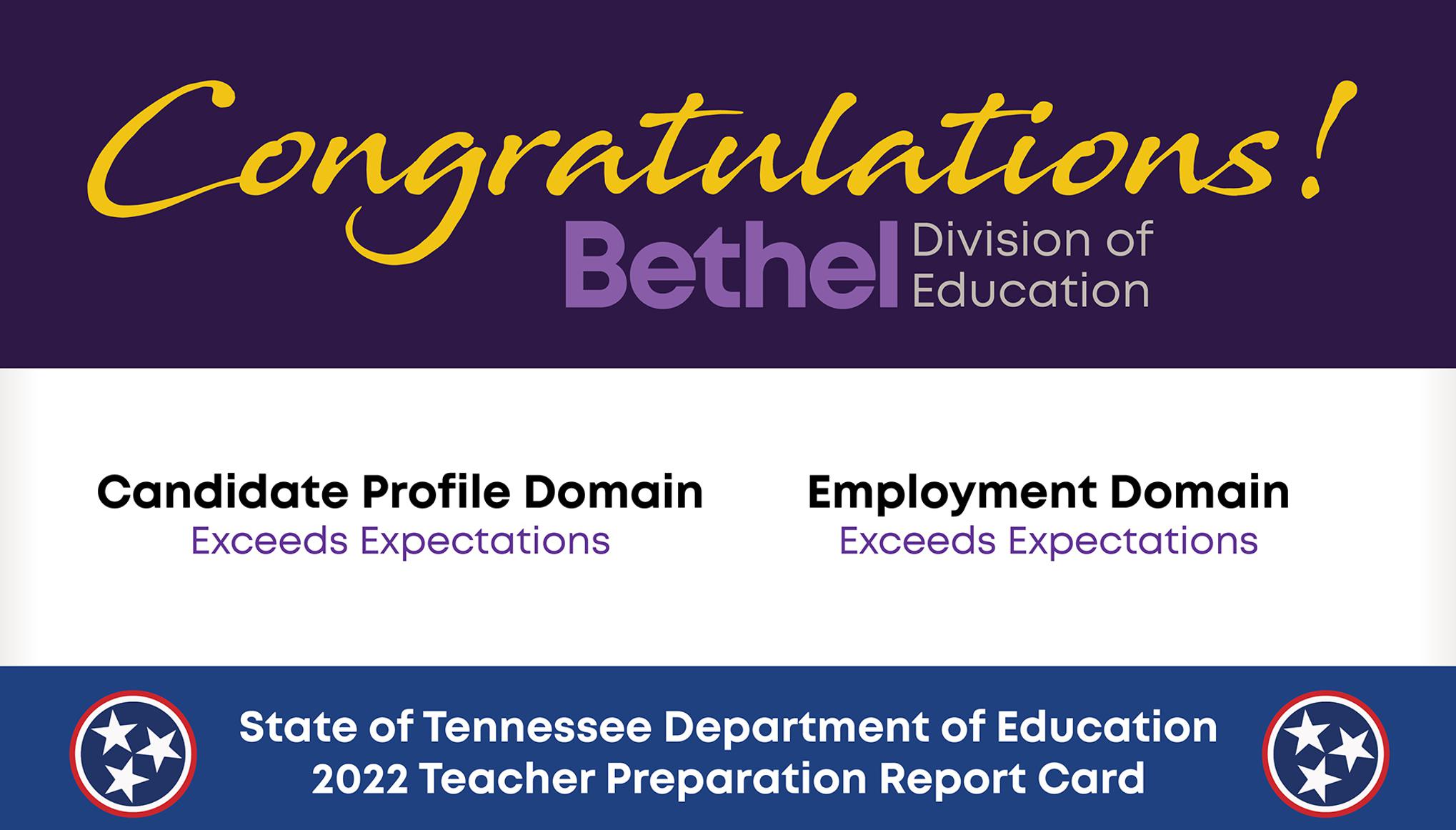 Bethel University’s Division of Education exceeds state expectations in key metrics, according to the annual Educator Preparation Report Card (EPRC) released last week by the Tennessee State Board of Education (SBE).